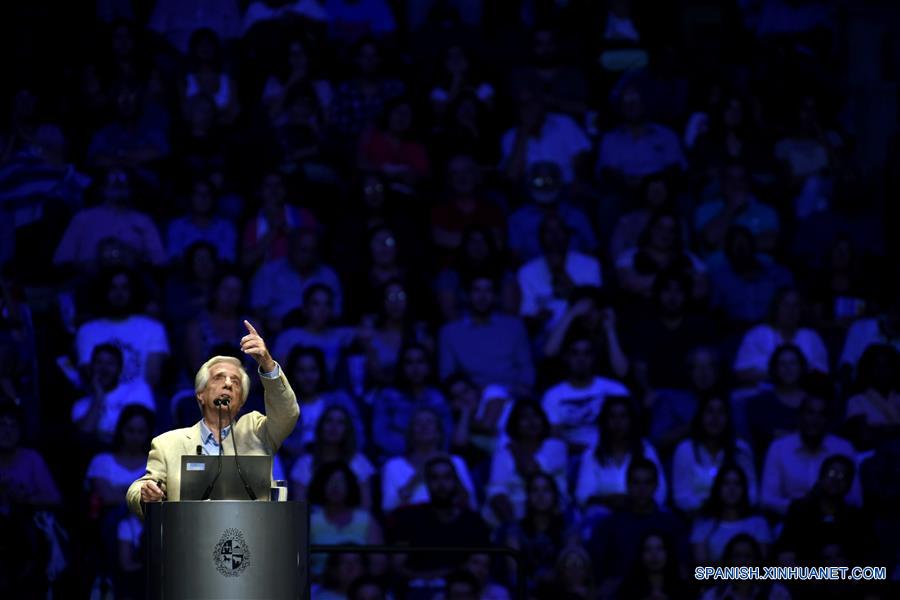 El presidente de Uruguay, Tabaré Vázquez, pronuncia un discurso sobre la rendición de cuentas anual, en el Antel Arena, en Montevideo, capital de Uruguay, el 1 de marzo de 2019. El presidente de Uruguay, Tabaré Vázquez, pidió el viernes al sistema político que la campa?a electoral para las elecciones presidenciales que elegirán a su sucesor sea "respetuosa" y "tolerante". Así lo dijo la noche del viernes en el acto por el cuarto aniversario de su mandato, el tercero consecutivo del izquierdista Frente Amplio (FA), celebrado en el estadio Antel Arena en Montevideo. (Xinhua/Nicolás Celaya)