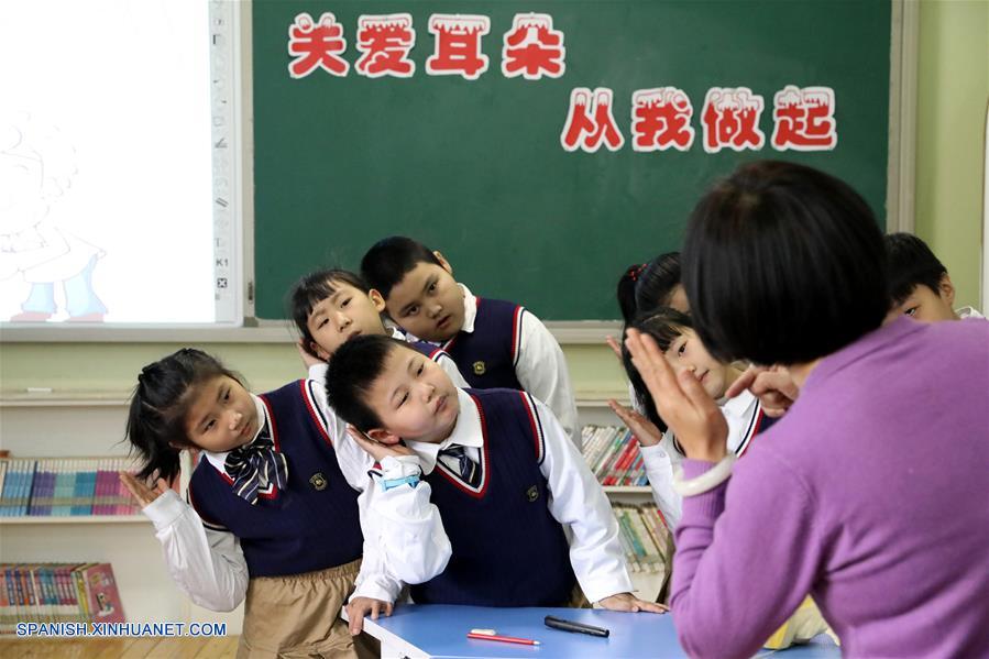 HEBEI, marzo 2, 2019 (Xinhua) -- Imagen del 1 de marzo de 2019 de una maestra mostrando el conocimiento del cuidado del oído a los estudiantes en una escuela primaria, en Shijiazhuang, provincia de Hebei, en el norte de China. El Día Internacional del Cuidado del Oído se celebra el 3 de marzo. (Xinhua/Liang Zidong)