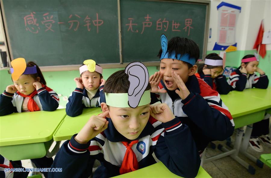HEBEI, marzo 2, 2019 (Xinhua) -- Imagen del 1 de marzo de 2019 de estudiantes experimentando un mundo silencioso para adquirir conciencia sobre el cuidado del oído durante una actividad especial en la Escuela Primaria Zhaowang, en Handan, provincia de Hebei, en el norte de China. El Día Internacional del Cuidado del Oído se celebra el 3 de marzo. (Xinhua/Hao Qunying)