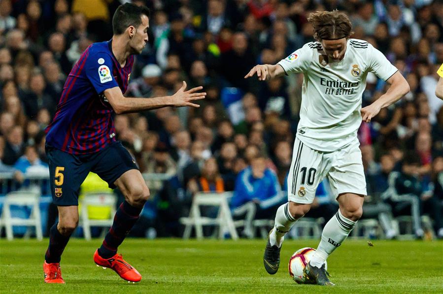 Imagen proveída por ZUMAPRESS, del jugador Luka Modric (d), de Real Madrid, disputando el balón con Sergio Busquets (i), de Barcelona, durante un partido de La Liga Espa?ola, en Madrid, Espa?a, el 2 de marzo de 2019. (Xinhua/Imago/ZUMAPRESS)