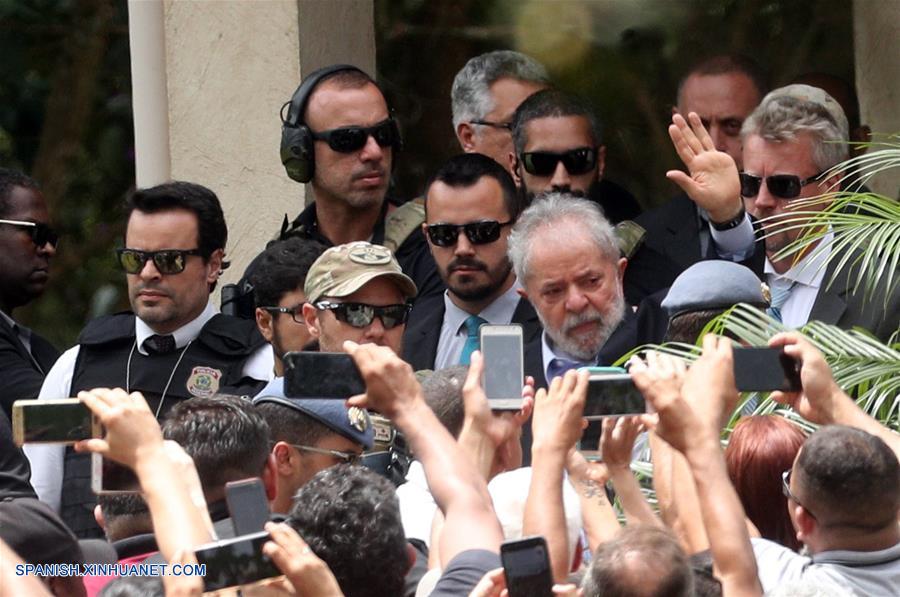 SAO PAULO, marzo 2, 2019 (Xinhua) -- Imagen proveída por AGENCIA ESTADO del ex presidente brasile?o, Luiz Inácio Lula da Silva (c), siendo escoltado por la policía al abandonar el cementerio Jardim Das Colinas después de asitir al velatorio y cremación de su nieto, en la ciudad de Sao Bernardo do Campo, en el Gran Sao Paulo, Brasil, el 2 de marzo de 2019. El ex presidente brasile?o Luiz Inácio Lula da Silva, quien fue liberado temporariamente desde que fue detenido el 7 de abril pasado, llegó el sábado a la ciudad de Sao Bernardo do Campo, en el Gran Sao Paulo, para participar del velatorio y cremación de su nieto de 7 a?os fallecido el viernes de meningitis. (Xinhua/Daniel Teixeira/AGENCIA ESTADO)