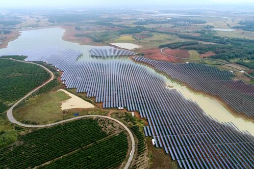 Esta imagen del 23 de octubre de 2018 muestra numerosos paneles solares fotovoltaicos alrededor del lago Yuejin, en el condado Fengxin de Yichun, provincia de Jiangxi, absorbiendo la luz solar. Se trata del primer proyecto de demostración complementaria de pesca y energía solar en la provincia de Jiangxi. En comparación con las centrales térmicas, este proyecto puede ahorrar 29.700 toneladas de carbón estándar y reducir el dióxido de carbono y otros contaminantes atmosféricos en casi 100.000 toneladas al a?o. (Shiyu / Diario del Pueblo)