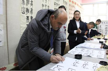 El 26 de febrero, los delegados visitaron la comunidadGuyuanxiang,un centro de demostración de la unidad étnica enUrumqiy practicaron caligrafía con los ni?os de la clase de caligrafía, cuya nombre es “Clase de las 6:30”.(Foto: Wang Hailin / Diario del Pueblo)
