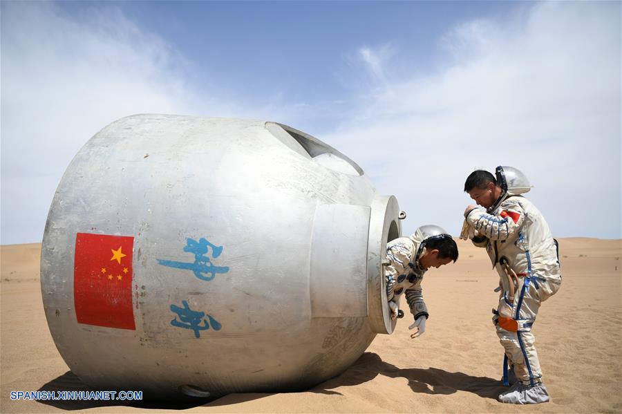 GANSU, 4 marzo, 2019 (Xinhua) -- Imagen del 17 de mayo de 2018 de los astronautas chinos, Nie Haisheng (i) y Liu Wang (d), saliendo de una cápsula de reentrada durante un entrenamiento de supervivencia en la naturaleza, en el Desierto de Badain Jaran, en la provincia de Gansu, en el noroeste de China. La Oficina de Ingeniería Espacial Tripulada de China anunció el lunes que el módulo central de la estación espacial del país, el cohete portador Gran Marcha-5B y sus cargas serán enviados al lugar de lanzamiento en el segundo semestre del a?o, con el fin de hacer preparativos para las misiones de la estación espacial. China tiene previsto completar la construcción de la estación espacial en torno a 2022. Será el laboratorio espacial del país con funcionamiento en órbita estable a largo plazo. (Xinhua/Chen Bin)