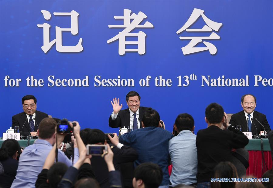 He Lifeng (c), director de la Comisión Nacional de Desarrollo y Reforma, Ning Jizhe (d) y Lian Weiliang (i), subdirectores de la comisión, participan en una la conferencia de prensa sobre el impulso del desarrollo de alta calidad de la economía china en el marco de la segunda sesión de la XIII Asamblea Popular Nacional en Beijing, capital de China, el 6 de marzo de 2019.(Xinhua/Wang Peng)