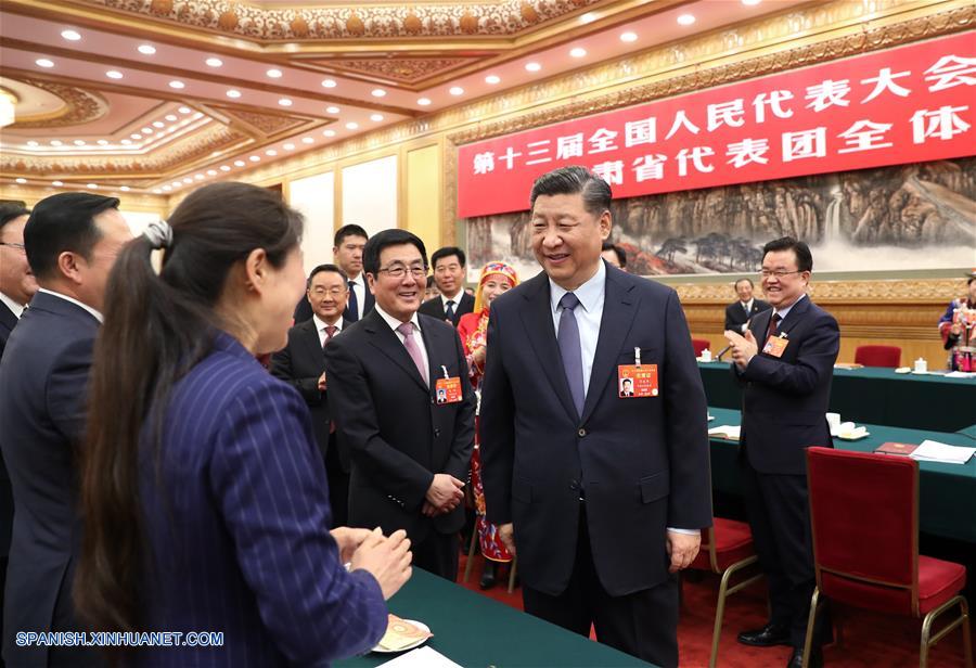 BEIJING, 7 marzo, 2019 (Xinhua) -- El presidente chino Xi Jinping, también secretario general del Comité Central del Partido Comunista de China (PCCh) y presidente de la Comisión Militar Central, participa en una discusión en grupo con diputados de la provincia de Gansu durante la segunda sesión de la XIII Asamblea Popular Nacional (APN) en Beijing, capital de China, el 7 de marzo de 2019. (Xinhua/Wang Ye)
