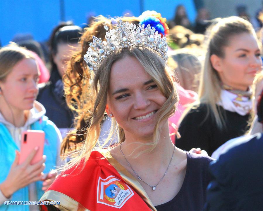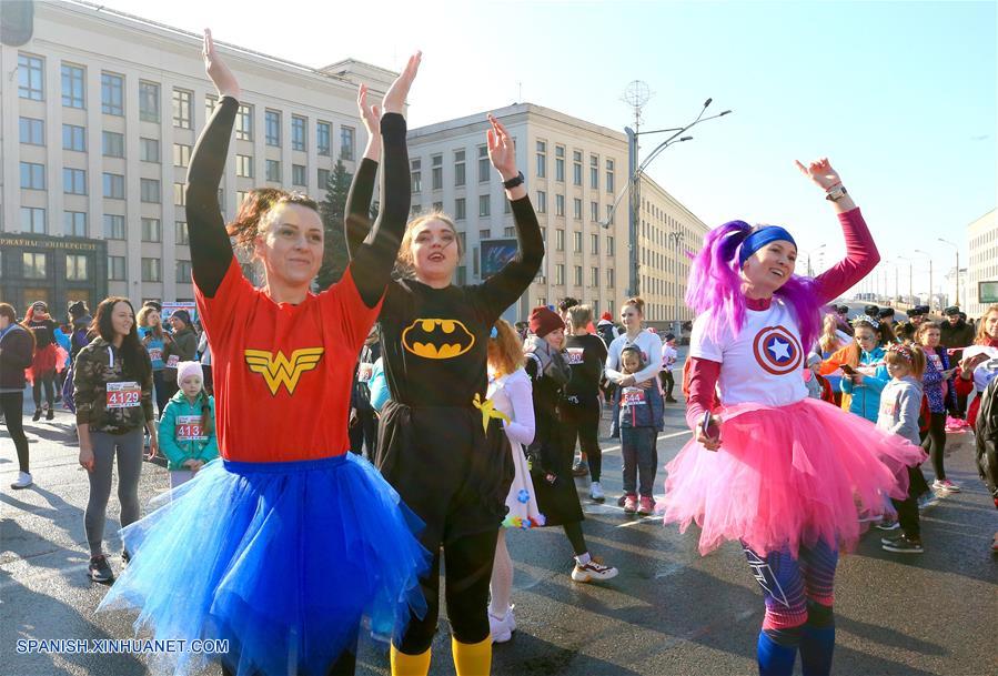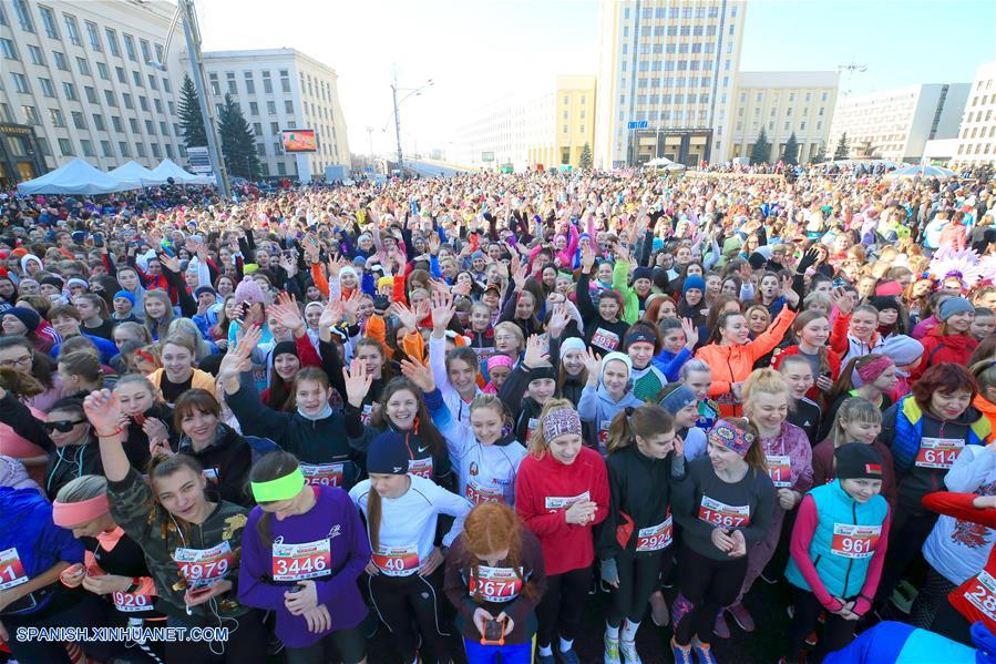 MINSK, 8 marzo, 2019 (Xinhua) -- Concursantes participan en una carrera de belleza en el marco del Día Internacional de la Mujer, en Minsk, Bielorrusia, el 8 de marzo de 2019. De acuerdo con información de la prensa local, más de 5.000 mujeres participaron en el evento llevado a cabo el viernes. (Xinhua/Efim Mazurevich)