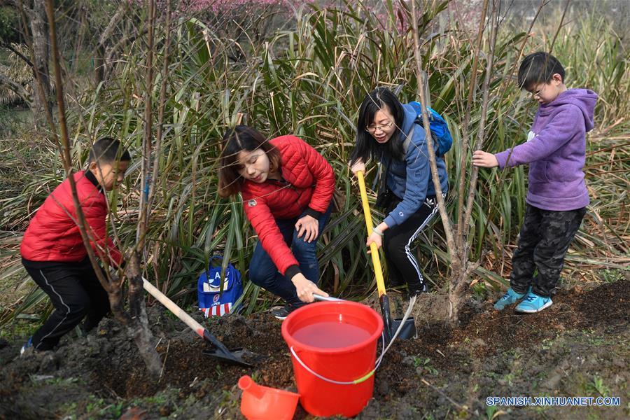 HANGZHOU, 10 marzo, 2019 (Xinhua) -- Personas plantan árboles en el Parque Nacional de Humedales Xixi en Hangzhou, en la provincia de Zhejiang, en el este de China, el 10 de marzo de 2019. Un total de 30 familias plantaron árboles en el parque de humedales el domingo para saludar el próximo Día del Arbol. (Xinhua/Huang Zongzhi)