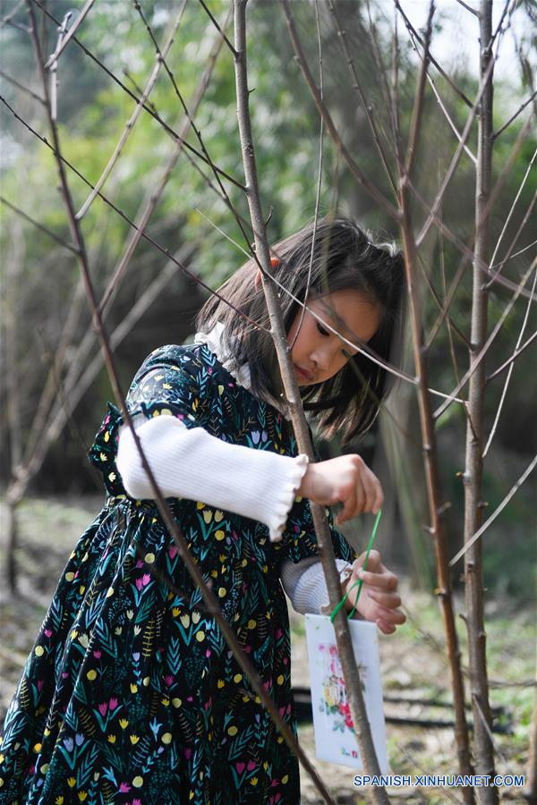 HANGZHOU, 10 marzo, 2019 (Xinhua) -- Una ni?a ata un cartel a un árbol para registrar su crecimiento en el Parque Nacional de Humedales Xixi en Hangzhou, en la provincia de Zhejiang, en el este de China, el 10 de marzo de 2019. Un total de 30 familias plantaron árboles en el parque de humedales el domingo para saludar el próximo Día del Arbol. (Xinhua/Huang Zongzhi)