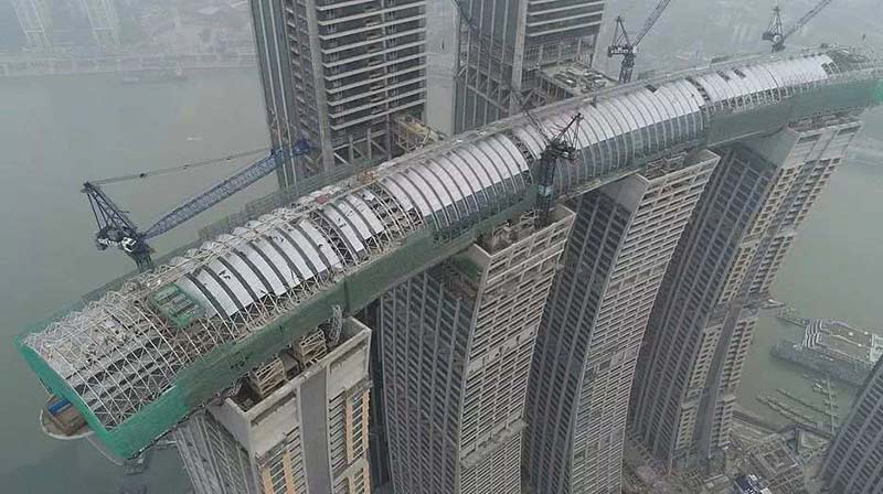 En Chongqing, China, la construcción del primer rascacielos horizontal del mundo está a punto de completarse. Le dicen "horizontal" porque hay un conjunto de ocho rascacielos que se elevan desde el suelo y uno de ellos “descansa” en forma de puente sobre varios de ellos. El rascacielos horizontal tiene más de 300 metros de largo y conecta cuatro de los rascacielos a una altura de 60 pisos, transformando instantáneamente la construcción en una "barco de vela" tridimensional.