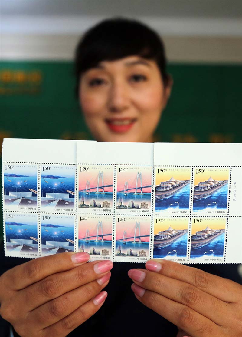El 30 de octubre de 2018, para conmemorar la apertura del Puente Hong Kong-Zhuhai-Macao, Correos de China, Correos de Hong Kong y Correos de Macao emitieron conjuntamente el sello conmemorativo "Puente Hong Kong-Zhuhai-Macao". La imagen muestra a un miembro de la Oficina de Correos del condado Boxing en Binzhou, provincia de Shandong, mostrando el sello del "Puente Hong Kong-Zhuhai-Macao". (Foto: Chen Bin / Diario del Pueblo)