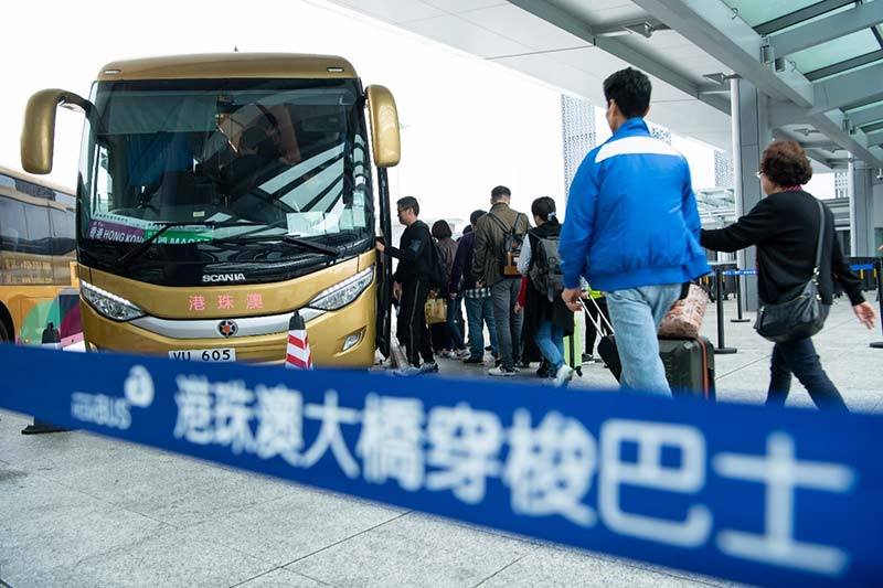 El 5 de febrero de 2019, los pasajeros se subieron al autobús en el edificio de inspección fronteriza de Macao del puente Hong Kong-Zhuhai-Macao con dirección a Hong Kong. (Foto: Agencia de Noticias Xinhua)