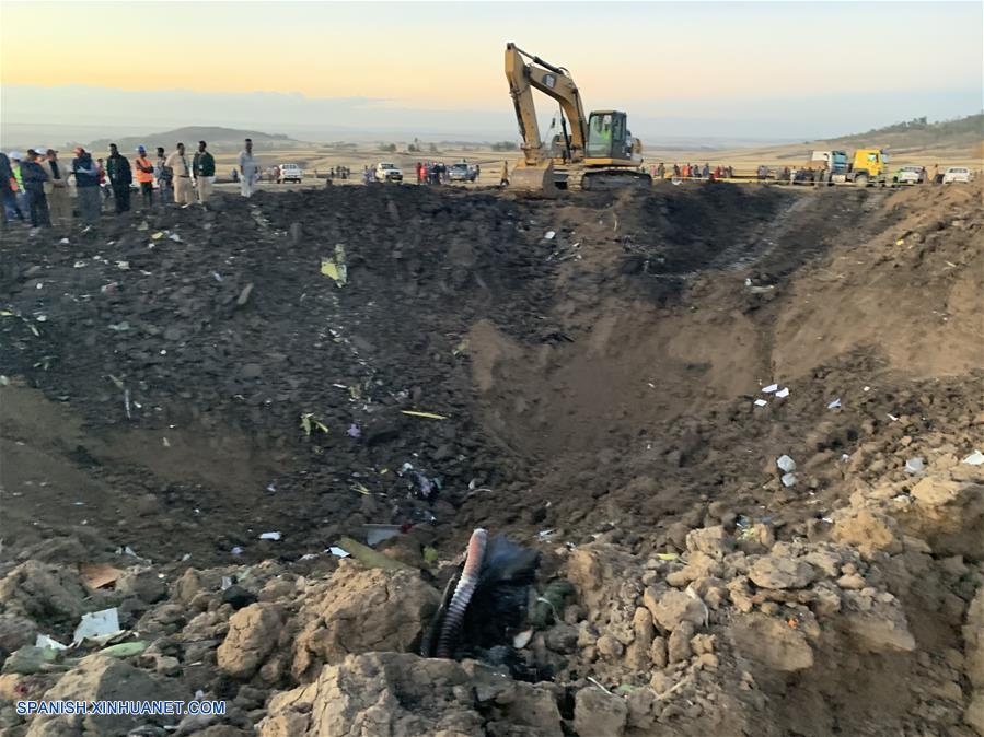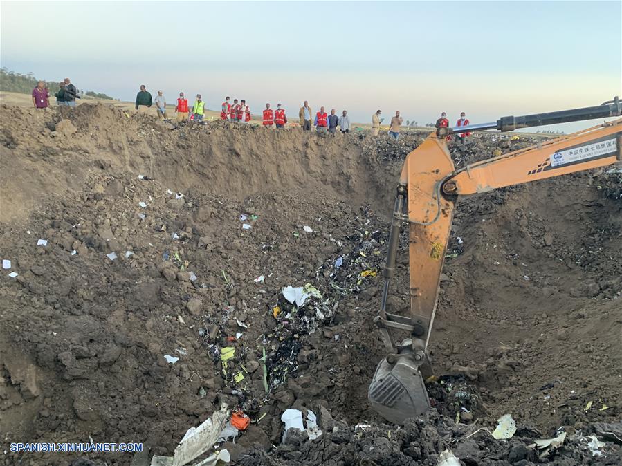 Una excavadora trabaja en el sitio del accidente de un avión de Ethiopian Airlines (ET) que se estrelló cerca de la ciudad de Bishoftu, a unos 45km al sureste de Addis Abeba, Etiopía, el 10 de marzo de 2019. Ethiopian Airlines confirmó la muerte de las 157 personas a bordo del vuelo con destino a Nairobi, Kenia, que se estrelló la ma?ana del domingo. Las 157 personas a bordo del ET 302 incluían a ciudadanos de más de 30 países, confirmó en conferencia de prensa el director general de Ethiopian Airlines Group, Tewolde Gebremariam. (Xinhua/Wang Shoubao)