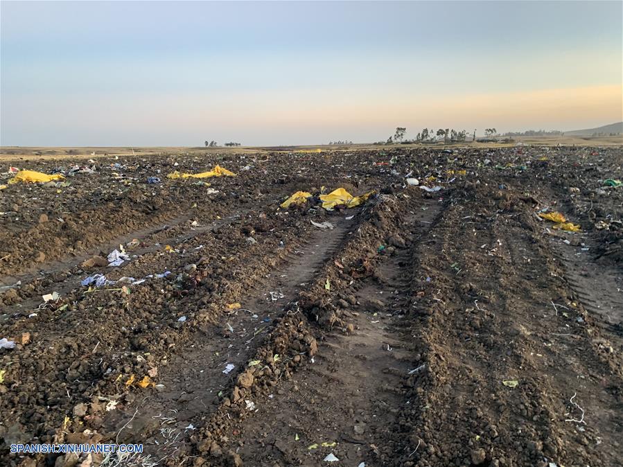 Vista de restos de un avión de Ethiopian Airlines (ET) que se estrelló cerca de la ciudad de Bishoftu, a unos 45km al sureste de Addis Abeba, Etiopía, el 10 de marzo de 2019. Ethiopian Airlines confirmó la muerte de las 157 personas a bordo del vuelo con destino a Nairobi, Kenia, que se estrelló la ma?ana del domingo. Las 157 personas a bordo del ET 302 incluían a ciudadanos de más de 30 países, confirmó en conferencia de prensa el director general de Ethiopian Airlines Group, Tewolde Gebremariam. (Xinhua/Wang Shoubao)