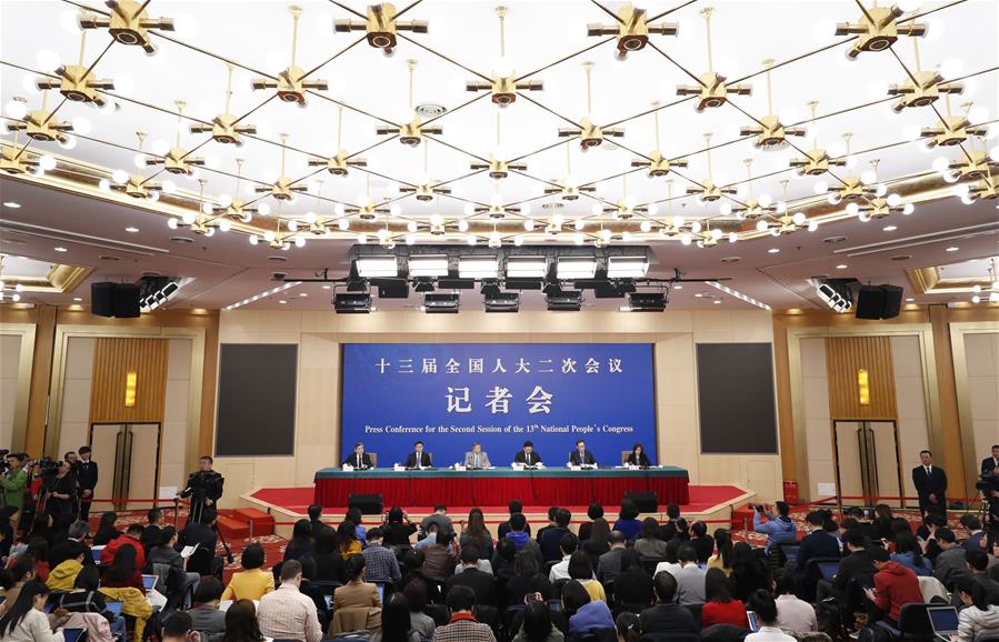 El gobernador del Banco Popular de China (BPCh), Yi Gang (3-i), el vicegobernador del BPCh, Chen Yulu (3-d), el vicegobernador del BPCh y el jefe de la Administración Estatal de Divisas, Pan Gongsheng (2-i), y el vicegobernador del BPCh, Fan Yifei (2-d), asisten a una conferencia de prensa sobre la reforma y el desarrollo financieros en el marco de la segunda sesión de la XIII Asamblea Popular Nacional (APN) en Beijing, capital de China, el 10 de marzo de 2019. (Xinhua/Shen Bohan)