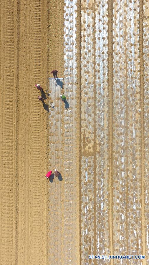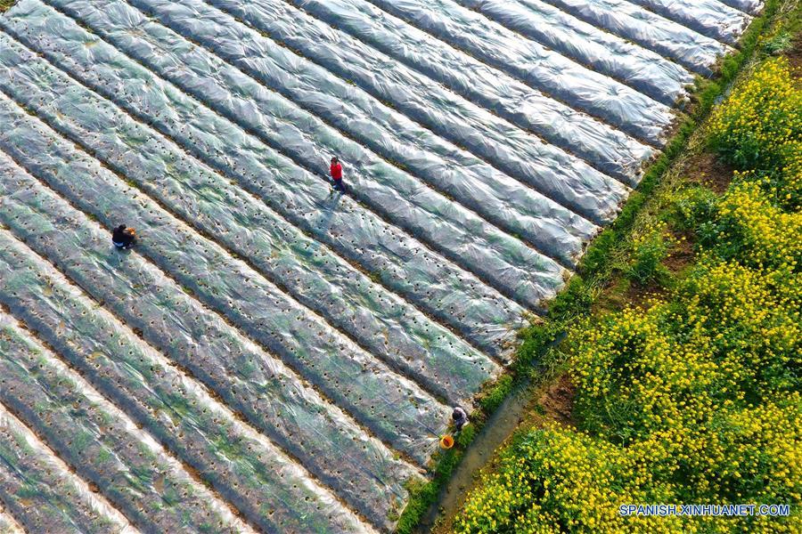 HUNAN, 11 marzo, 2019 (Xinhua) -- Vista aérea de residentes transplantando pimientos en campos en la villa Diping, del municipio de Zimenqiao, en el condado de Shuangfeng, en la provincia de Hunan, en el centro de China, el 11 de marzo de 2019. Con el aumento en la temperatura, los granjeros se encuentran ocupados con su trabajo agrícola. (Xinhua/Li Jianxin)