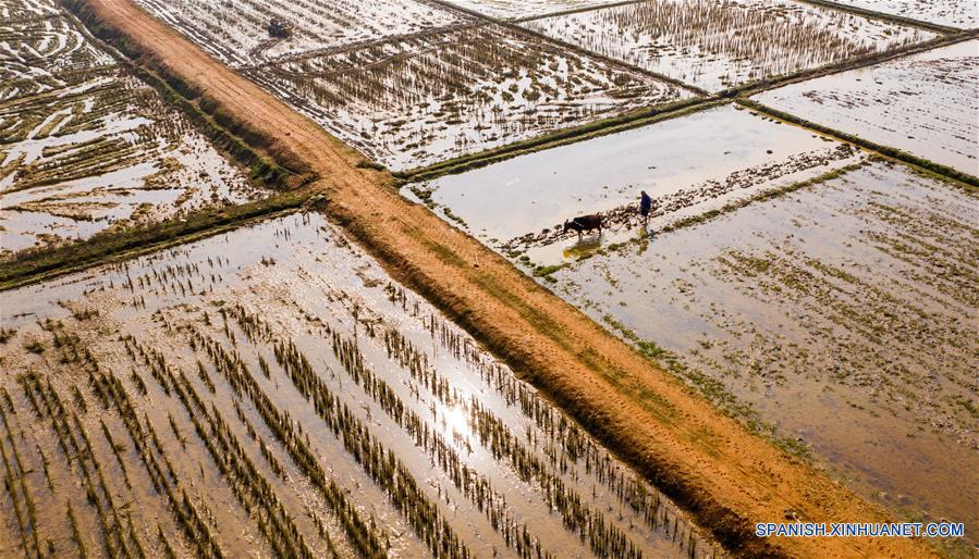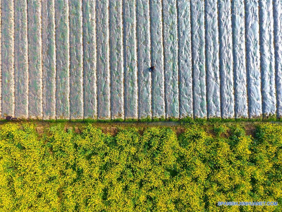 JIANGXI, 11 marzo, 2019 (Xinhua) -- Vista aérea de un granjero trabajando en los campos en la villa Nan'an del distrito de Yushui, en la ciudad de Xinyu, en la provincia de Jiangxi, en el este de China, el 11 de marzo de 2019. Con el aumento en la temperatura, los granjeros se encuentran ocupados con su trabajo agrícola. (Xinhua/Zhao Chunliang)