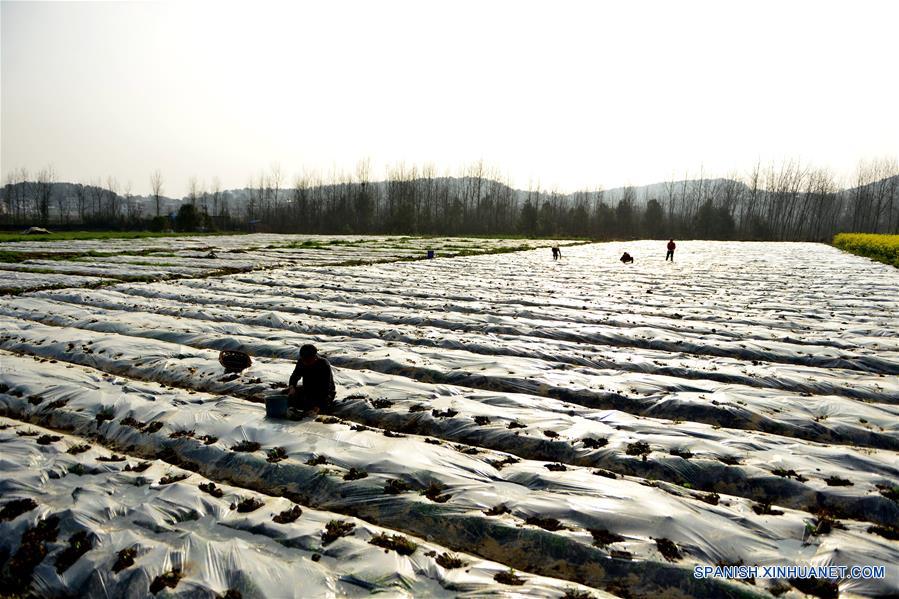 HUNAN, 11 marzo, 2019 (Xinhua) -- Residentes trabajan en campos en la villa Diping, del municipio de Zimenqiao, en el condado de Shuangfeng, en la provincia de Hunan, en el centro de China, el 11 de marzo de 2019. Con el aumento en la temperatura, los granjeros se encuentran ocupados con su trabajo agrícola. (Xinhua/Li Jianxin)