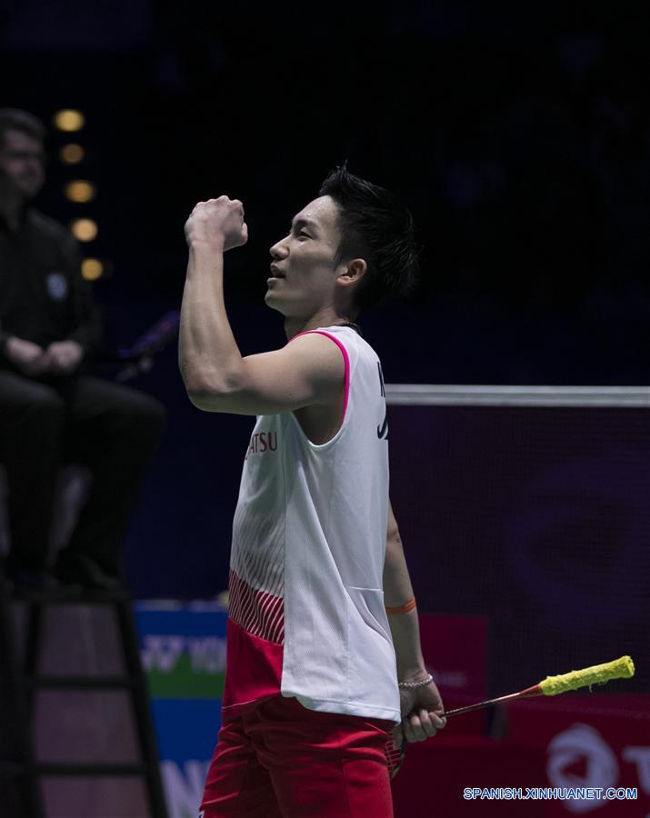 BIRMINGHAM, 10 marzo, 2019 (Xinhua) -- Kento Momota, de Japón, reacciona durante la final individual varonil del Campeonato Abierto de Bádminton All England 2019, ante Viktor Axelsen de Dinamarca, en Birmingham, Reino Unido, el 10 de marzo de 2019. (Xinhua/Han Yan)