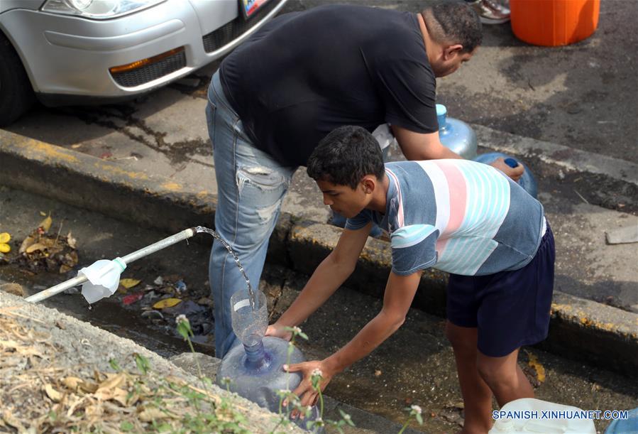 Personas recogen agua durante el apagón, en Caracas, Venezuela, el 11 de marzo de 2019. El ministro venezolano de Comunicación, Jorge Rodríguez, informó el lunes que quedan suspendidas por 24 horas más las actividades escolares y laborales por el masivo apagón que afecta al país desde el 7 de marzo. (Xinhua/Str)