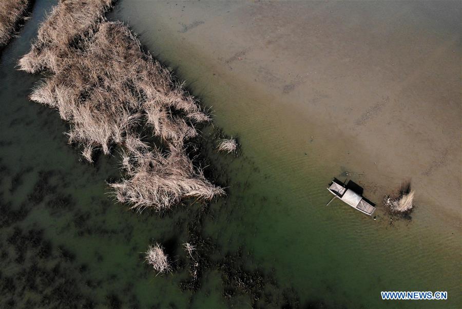 Foto aérea tomada el 10 de marzo del 2019 que muestra un barco en el área escénica del lago Qianzi en Guide, prefectura autónoma tibetana de Hainan, provincia de Qinghai. (Foto: Xinhua/ Zhang Hongxiang)