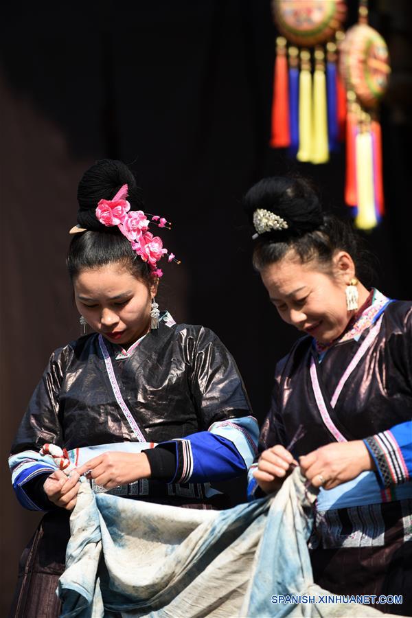 GUIZHOU, 12 marzo, 2019 (Xinhua) -- Mujeres del grupo étnico Dong elaboran nudos para te?ido de ropa en una cooperativa artesanal tradicional rural, en el condado de Liping, provincia de Guizhou, en el suroeste de China, el 12 de marzo de 2019. El proyecto cultural y creativo en el condado de Liping, que sirve como parte de los proyectos de alivio de la pobreza, proporciona entrenamiento de habilidades para las mujeres que viven en la pobreza. Los participantes están inspirados para dise?ar productos para te?ir, bordado y otras artesanías exquisitas. (Xinhua/Yang Wenbin)