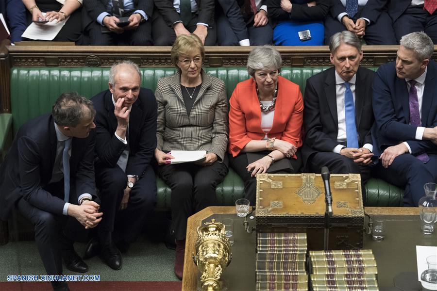 LONDRES, 12 marzo, 2019 (Xinhua) -- La primera ministra británica, Theresa May (3-d), participa durante la votación del acuerdo de Brexit en la Cámara de los Comunes, en Londres, Reino Unido, el 12 de marzo de 2019. El acuerdo sobre el "brexit" de la primera ministra británica Theresa May fue rechazado de nuevo este martes por los miembros del Parlamento en la segunda votación significativa desde enero, lo que aumenta la incertidumbre con respecto a la manera en que el país saldrá de la Unión Europea (UE). (Xinhua/UK Parliament/Jessica Taylor)
