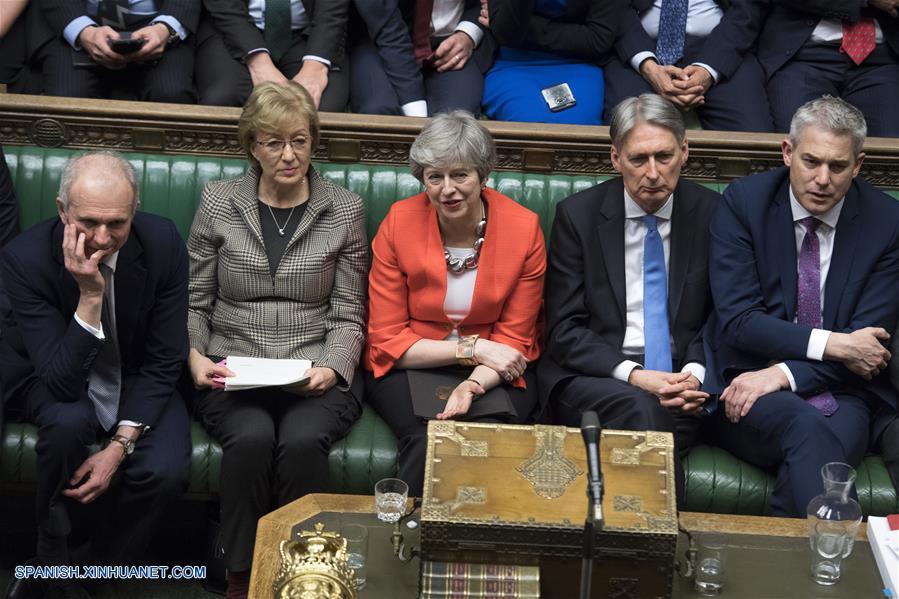 LONDRES, 12 marzo, 2019 (Xinhua) -- La primera ministra británica, Theresa May (c), participa durante la votación del acuerdo de Brexit en la Cámara de los Comunes, en Londres, Reino Unido, el 12 de marzo de 2019. El acuerdo sobre el "brexit" de la primera ministra británica Theresa May fue rechazado de nuevo este martes por los miembros del Parlamento en la segunda votación significativa desde enero, lo que aumenta la incertidumbre con respecto a la manera en que el país saldrá de la Unión Europea (UE). (Xinhua/UK Parliament/Jessica Taylor)
