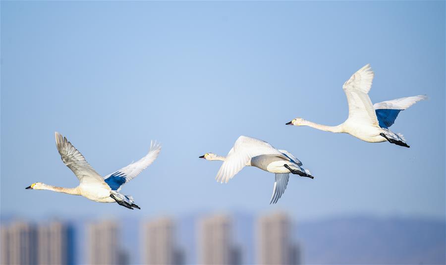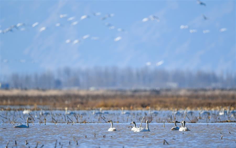 ORDOS, 13 marzo, 2019 (Xinhua) -- Imagen del 12 de marzo de 2019 de cisnes volando en el humedal del río Amarillo, en Dalad Qi, Ordos, en la región autónoma de Mongolia Interior, en el norte de China. (Xinhua/Peng Yuan)
