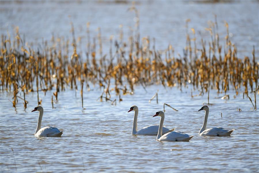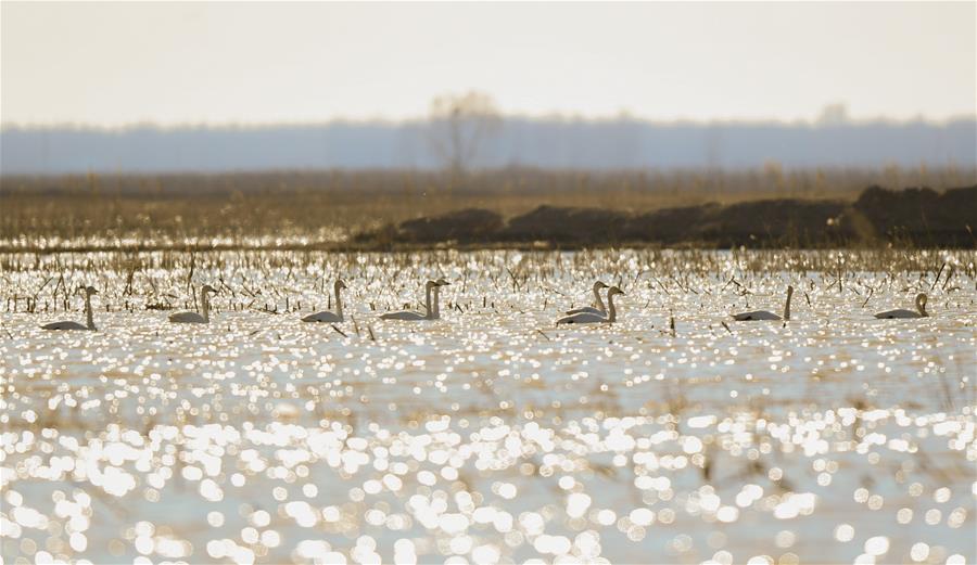 ORDOS, 13 marzo, 2019 (Xinhua) -- Imagen del 12 de marzo de 2019 de cisnes nadando en el humedal del río Amarillo, en Dalad Qi, Ordos, en la región autónoma de Mongolia Interior, en el norte de China. (Xinhua/Peng Yuan)