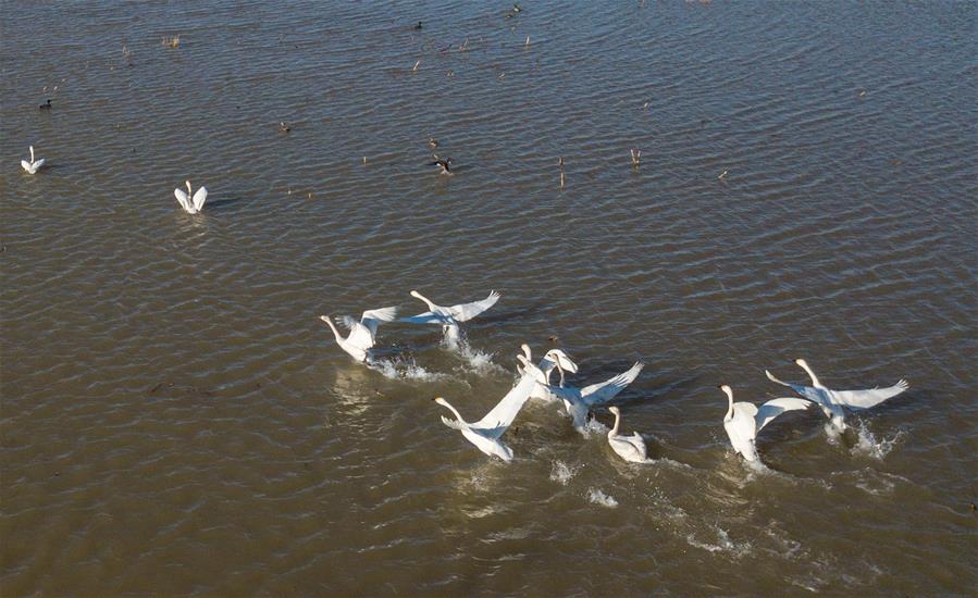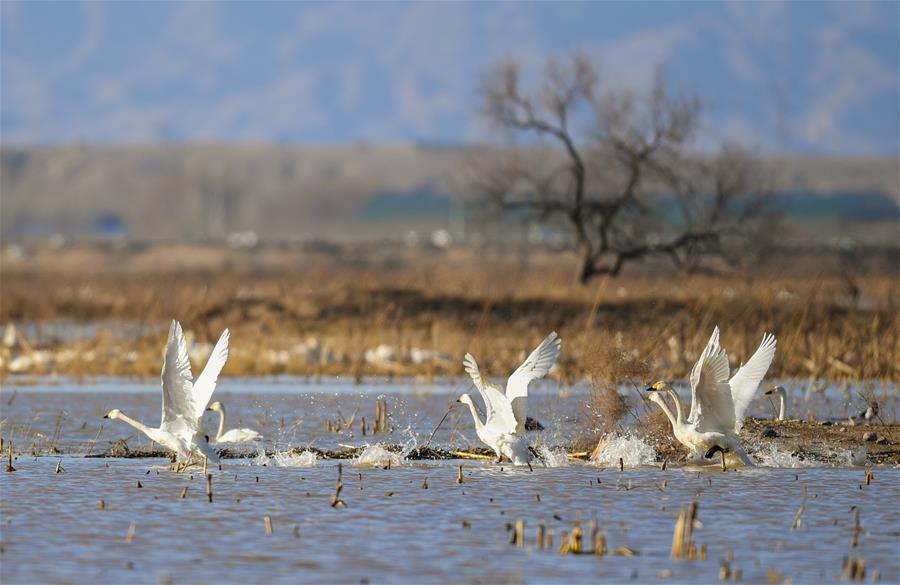 ORDOS, 13 marzo, 2019 (Xinhua) -- Imagen del 12 de marzo de 2019 de cisnes revoloteando en el humedal del río Amarillo, en Dalad Qi, Ordos, en la región autónoma de Mongolia Interior, en el norte de China. (Xinhua/Peng Yuan)