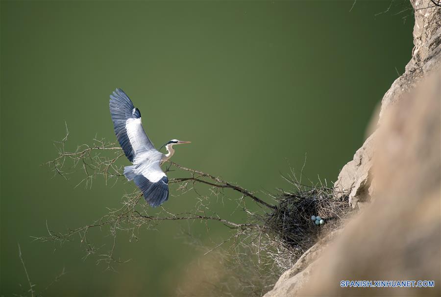SHANXI, 13 marzo, 2019 (Xinhua) -- Imagen del 12 de marzo de 2019 de una garza posándose sobre una rama cerca de un nido, en el condado de Pinglu, provincia de Shanxi, en el norte de China. Cuando el clima se vuelve cálido, cientos de garzas construyen sus nidos y se reproducen en Pinglu en la temporada de primavera. (Xinhua/Liu Wenli)