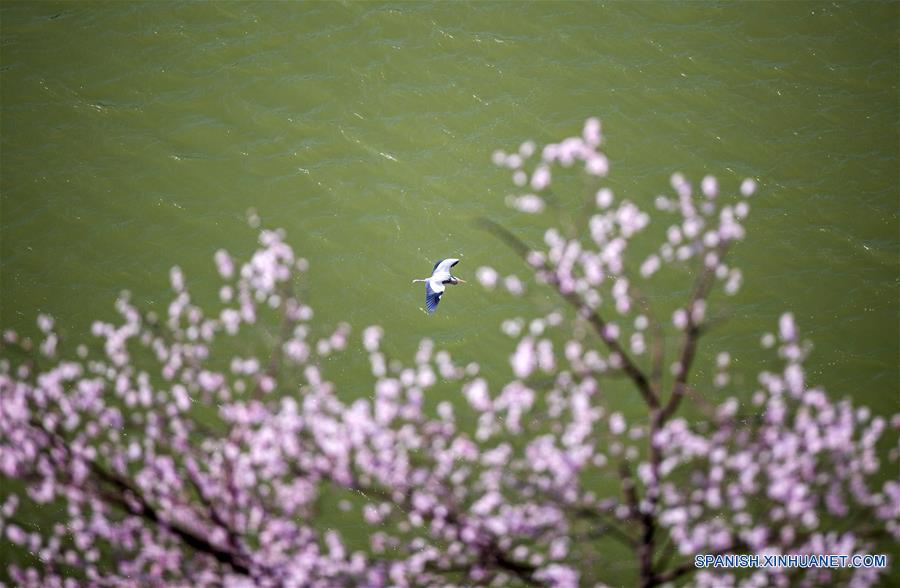 SHANXI, 13 marzo, 2019 (Xinhua) -- Imagen del 12 de marzo de 2019 de una garza volando sobre el río Amarillo, en el condado de Pinglu, provincia de Shanxi, en el norte de China. Cuando el clima se vuelve cálido, cientos de garzas construyen sus nidos y se reproducen en Pinglu en la temporada de primavera. (Xinhua/Liu Wenli)