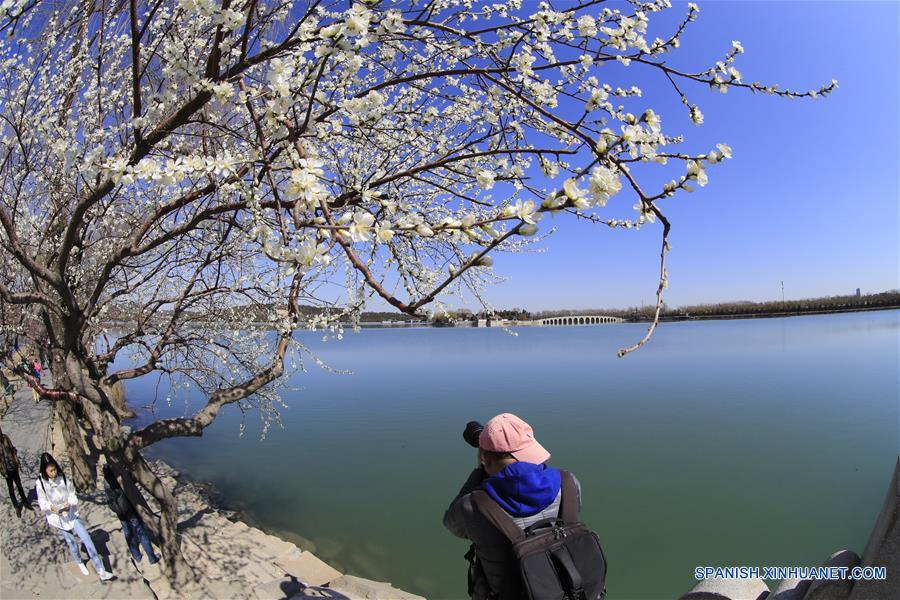 BEIJING, 13 marzo, 2019 (Xinhua) -- Un visitante toma fotografías del paisaje junto al Lago Kunming en el Palacio de Verano, en Beijing, capital de China, el 13 de marzo de 2019. (Xinhua/Liu Xianguo)