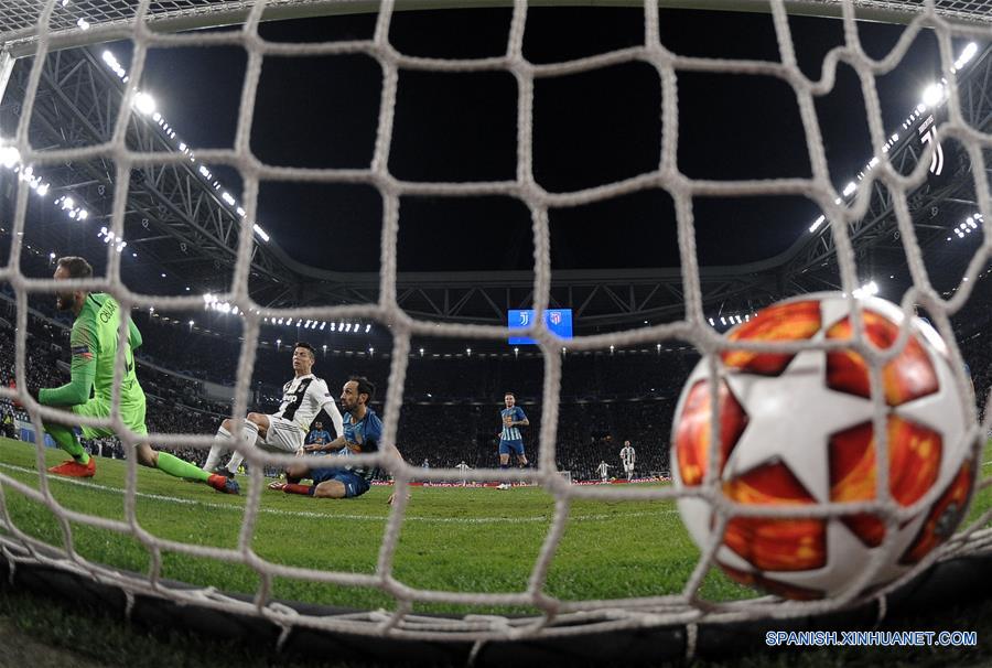 TURIN, 13 marzo, 2019 (Xinhua) -- Imagen del 12 de marzo de 2019 del jugador Cristiano Ronaldo (i), de Juventus, realizando su anotación durante el partido de vuelta de los octavos de final de la Liga de Campeones de la Unión de Asociaciones de Fútbol Europeas (UEFA, por sus siglas en inglés), ante Atlético de Madrid, celebrado en Turín, Italia. Juventus ganó el encuentro. (Xinhua/Alberto Lingria)