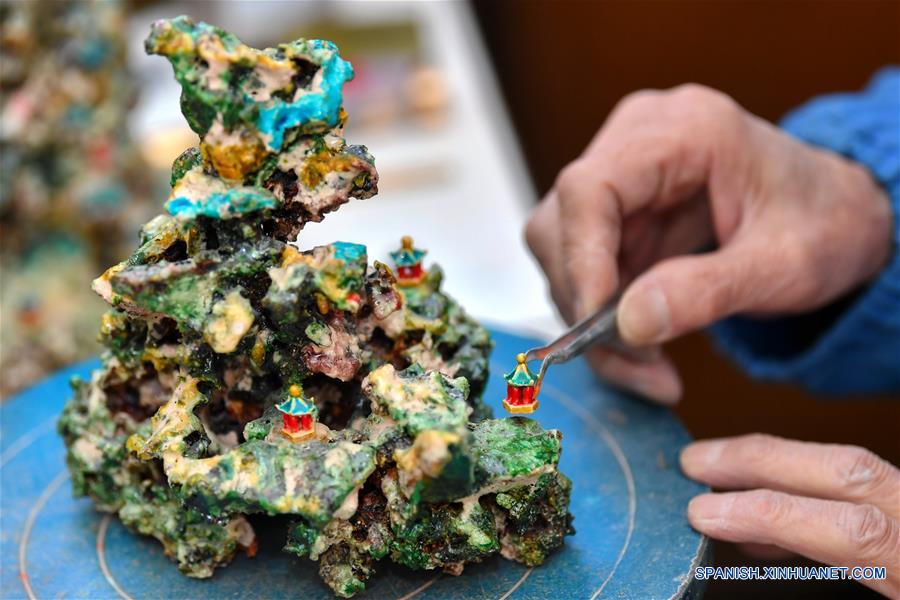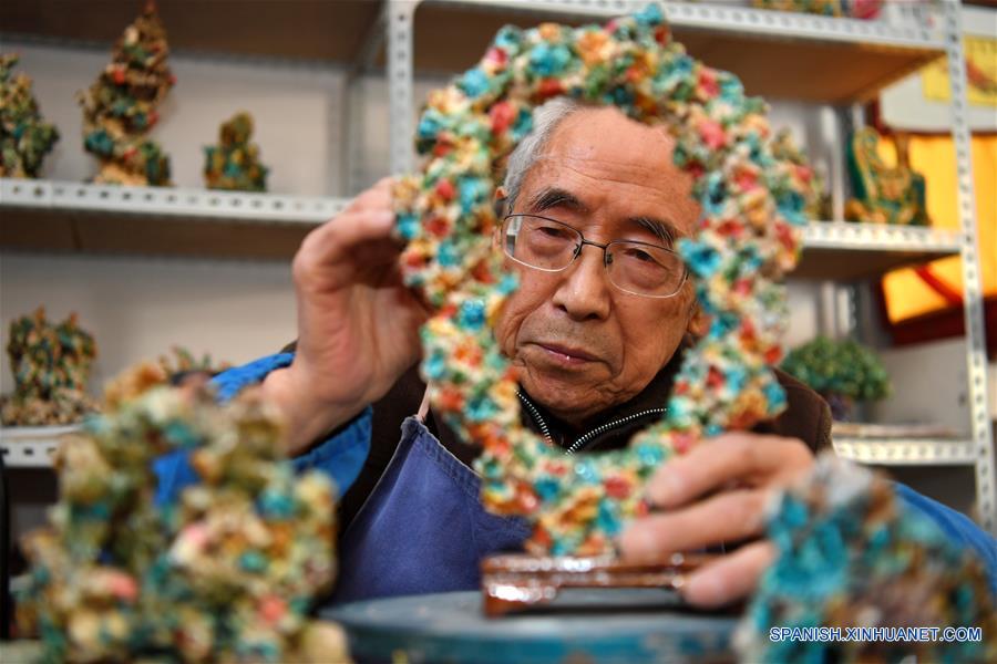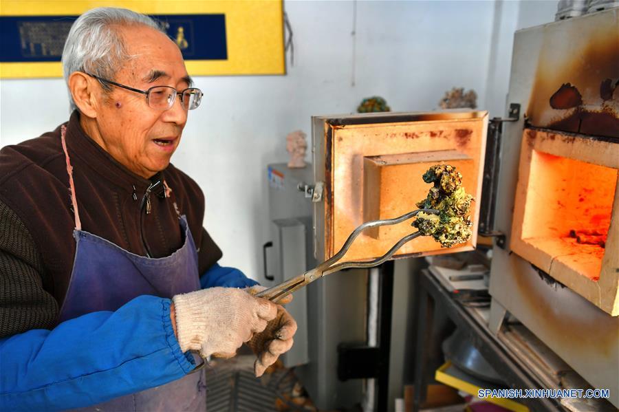 SHANXI, 13 marzo, 2019 (Xinhua) -- Ge Yuansheng, heredero de la habilidad de cocción de esmalte coloreado, un patrimonio cultural intangible nacional catalogado en 2008, trabajando en una pieza de esmalte de color hecha de ceniza de carbón, en su taller en Taiyuan, provincia de Shanxi, en el norte de China, el 13 de marzo de 2019. Ge Yuansheng ha estado aplicando su habilidad de cocción de esmalte coloreado a los residuos de ceniza de carbón durante cinco a?os. Después de pasar por docenas de procesos, el material de desecho se convertirá en delicadas obra de arte. (Xinhua/Cao Yang)