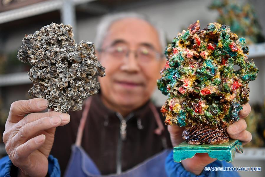 SHANXI, 13 marzo, 2019 (Xinhua) -- Ge Yuansheng, heredero de la habilidad de cocción de esmalte coloreado, un patrimonio cultural intangible nacional catalogado en 2008, mostrando una pieza de ceniza de carbón (i) y una pieza de esmalte de color hecha de ceniza de carbón, en su taller en Taiyuan, provincia de Shanxi, en el norte de China, el 13 de marzo de 2019. Ge Yuansheng ha estado aplicando su habilidad de cocción de esmalte coloreado a los residuos de ceniza de carbón durante cinco a?os. Después de pasar por docenas de procesos, el material de desecho se convertirá en delicadas obra de arte. (Xinhua/Cao Yang)