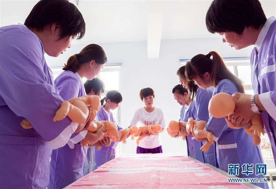 Los estudiantes de un programa de capacitación para ayudantes domésticos, practican con mu?ecas durante un curso de ense?anza de cuidado infantil en Hebei, el 28 de junio de 2018. [Foto: Zhu Xudong / Xinhua]