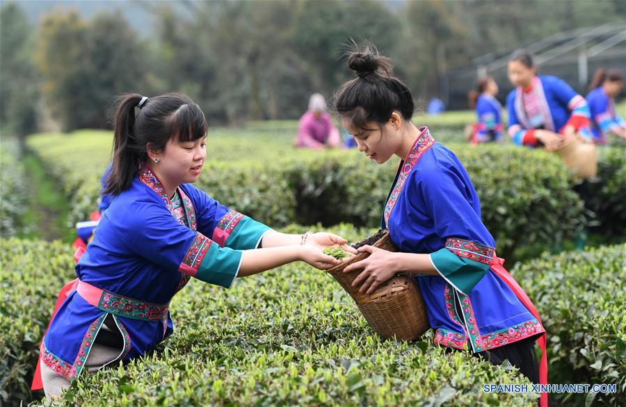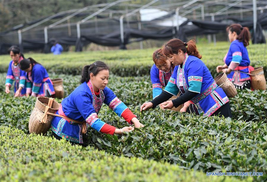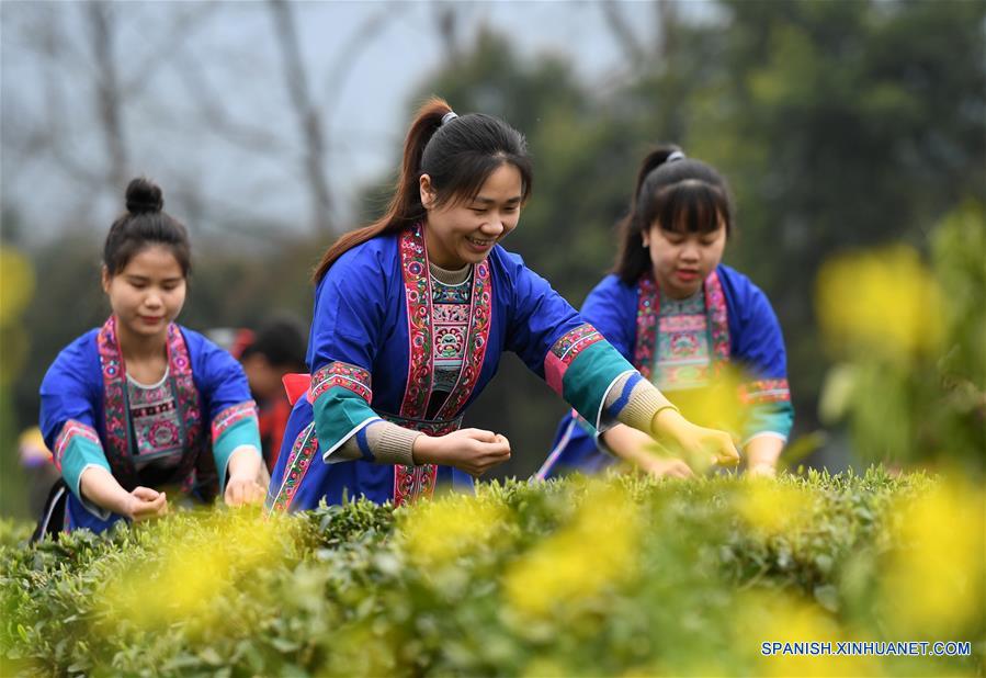 GUANGXI, 14 marzo, 2019 (Xinhua) -- Agricultoras de té recolectan hojas de té en la villa de Zhouya del municipio de Doujiang en el condado autónomo de la etnia dong de Sanjiang, en la región autónoma de la etnia zhuang de Guangxi, en el sur de China, el 14 de marzo de 2019. (Xinhua/Lu Boan)