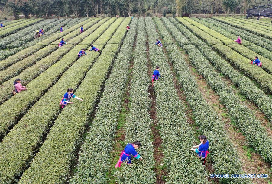 GUANGXI, 14 marzo, 2019 (Xinhua) -- Vista aérea de agricultoras de té recolectando hojas de té en la villa de Zhouya del municipio de Doujiang en el condado autónomo de la etnia dong de Sanjiang, en la región autónoma de la etnia zhuang de Guangxi, en el sur de China, el 14 de marzo de 2019. (Xinhua/Lu Boan)