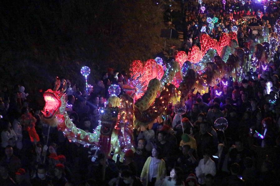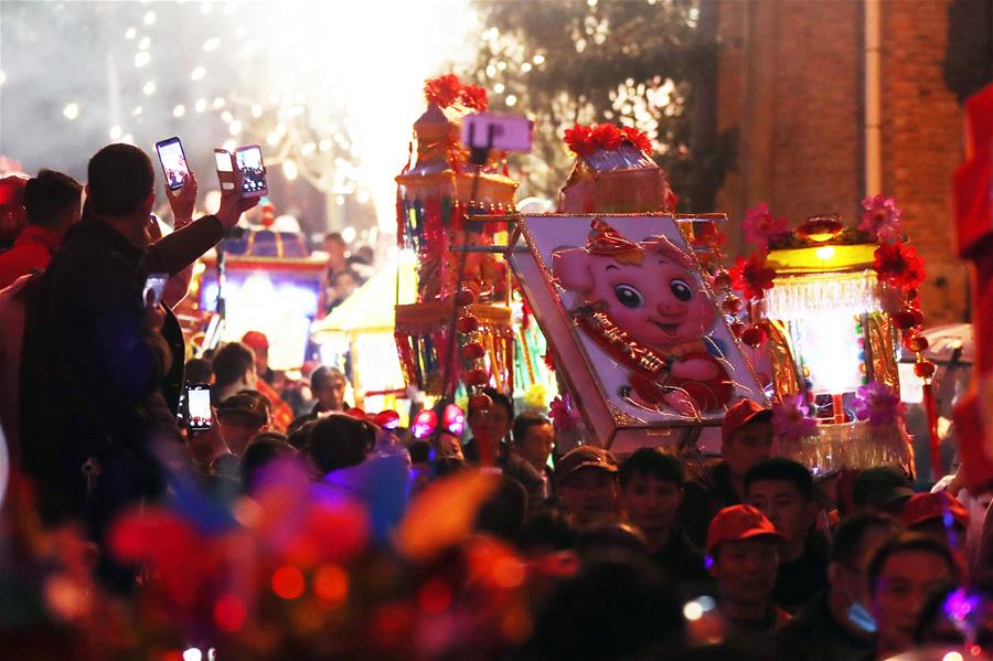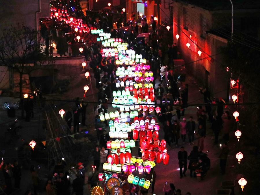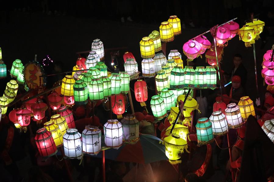 HUNAN, 14 marzo, 2019 (Xinhua) -- Imagen del 13 de marzo de 2019 de personas sosteniendo coloridos faroles mientras participan en la celebración del Festival Huodeng, en la localidad de Jiepai del condado de Hengyang, provincia de Hunan, en el centro de China. El Festival Huodeng se llevó a cabo para desear buena suerte en el a?o nuevo. (Xinhua/Luo Meng)