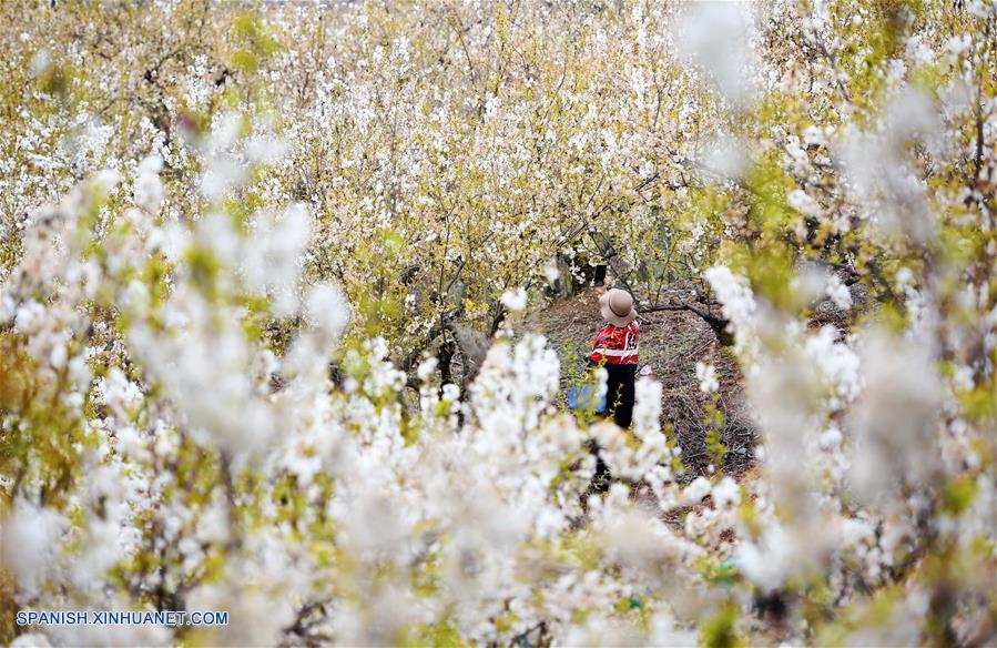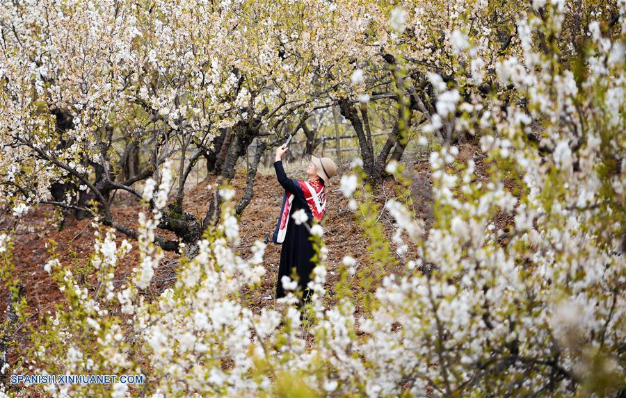 SHAANXI, 15 marzo, 2019 (Xinhua) -- Imagen del 14 de marzo de 2019 de una turista tomándose tomando fotografías de las flores de cerezo, en el condado de Xixiang, provincia de Shaanxi, en el noroeste de China. (Xinhua/Liu Xiao)