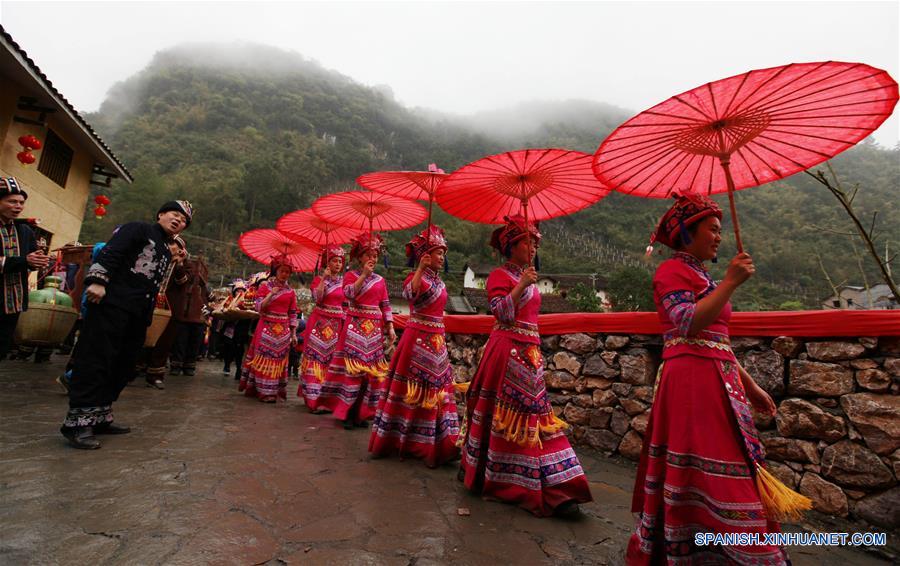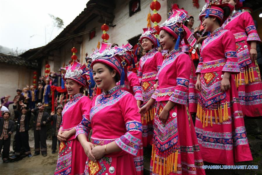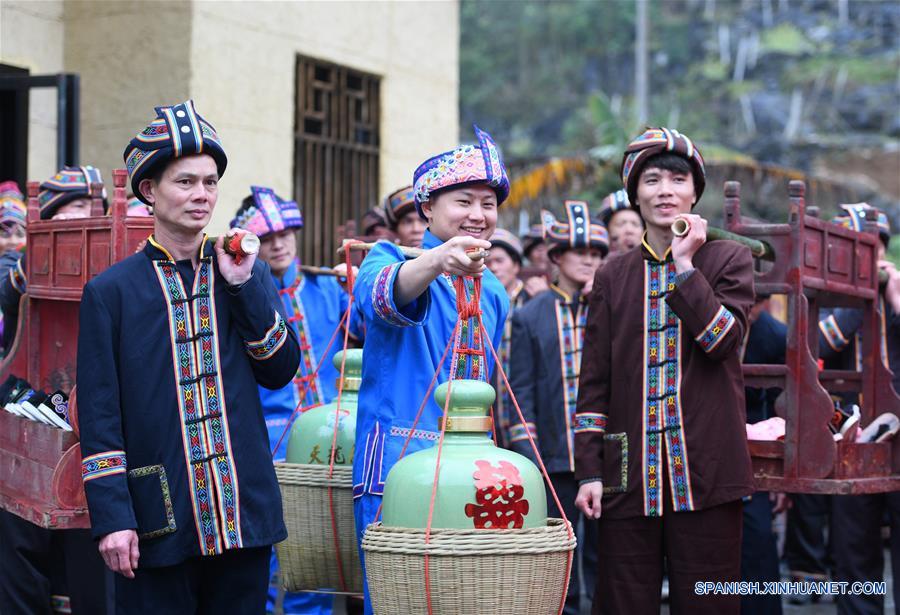 GUANGXI, 17 marzo, 2019 (Xinhua) -- Un equipo escolta a la novia a la casa del novio durante una ceremonia de boda en la villa de Mianhua de la municipalidad de Siba del Condado Autónomo Mulao de Luocheng, en la Región Autónoma Zhuang de Guangxi, en el sur de China, el 17 de marzo de 2019. Una tradicional ceremonia de boda del grupo étnico mulao se llevó a cabo el domingo. (Xinhua/Meng Zengshi)