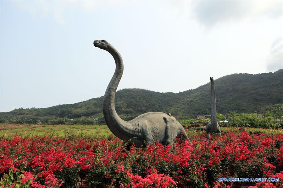 HAINAN, 18 marzo, 2019 (Xinhua) -- Imagen del 17 de marzo de 2019 de modelos de dinosaurios a tama?o real son exhibidos en el Sanya Haitang Bay Paddy Field Park, en Sanya, en la provincia de Hainan, en el sur de China. Más de 76 millones de turistas nacionales y extranjeros visitaron la provincia insular en 2018, una subida interanual del 11,8 por ciento, y los ingresos de turismo aumentaron un 14,5 por ciento durante el a?o anterior y superaron los 95.000 millones de yuanes (14.000 millones de dólares), mostraron los datos de la autoridad de turismo de Hainan. (Xinhua/Sui Xiankai)
