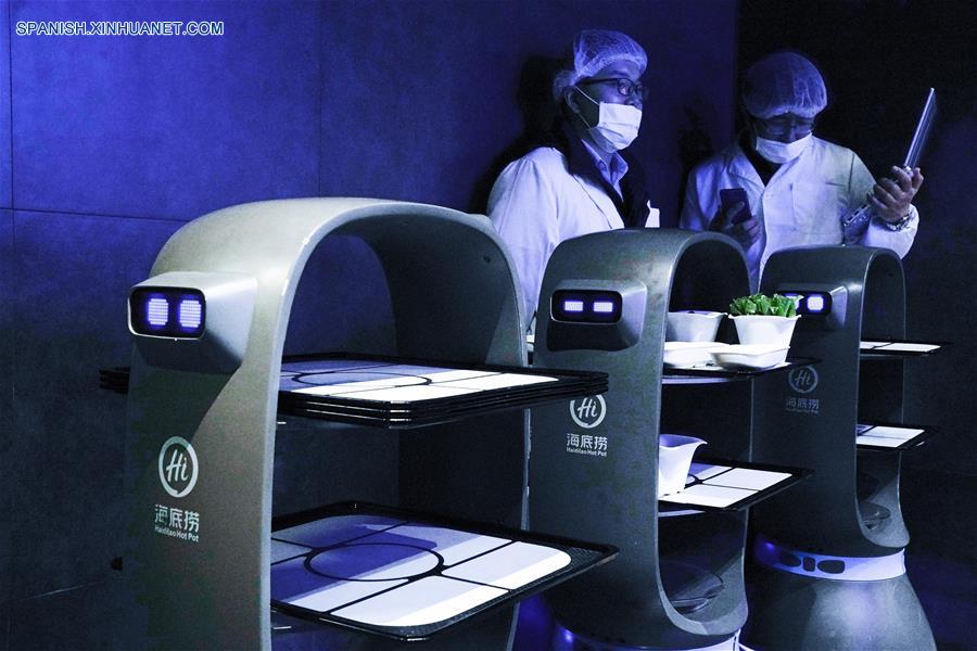 SHANGHAI, 18 marzo, 2019 (Xinhua) -- Imagen del 15 de octubre de 2018 de un robot AGV (vehículo guiado automáticamente) sirve comida a los clientes en un restaurante inteligente operado por el gigante del comercio electrónico chino Alibaba, en el Centro Nacional de Exposiciones y Convenciones, en Shanghai, en el este de China. El sector de la restauración de China registró unos ingresos récord de 4,27 billones de yuanes (636.000 millones de dólares) en 2018, dijo el domingo la Asociación de Cocina de China. Este volumen representó el 11,2 por ciento del total de las ventas minoristas del a?o pasado y fue un 0,4 por ciento superior al de 2017, dijo Jiang Junxian, presidente de la asociación. El sector también aportó un 20,9 por ciento al crecimiento del consumo en 2018, indicó. (Xinhua/Fang Zhe)