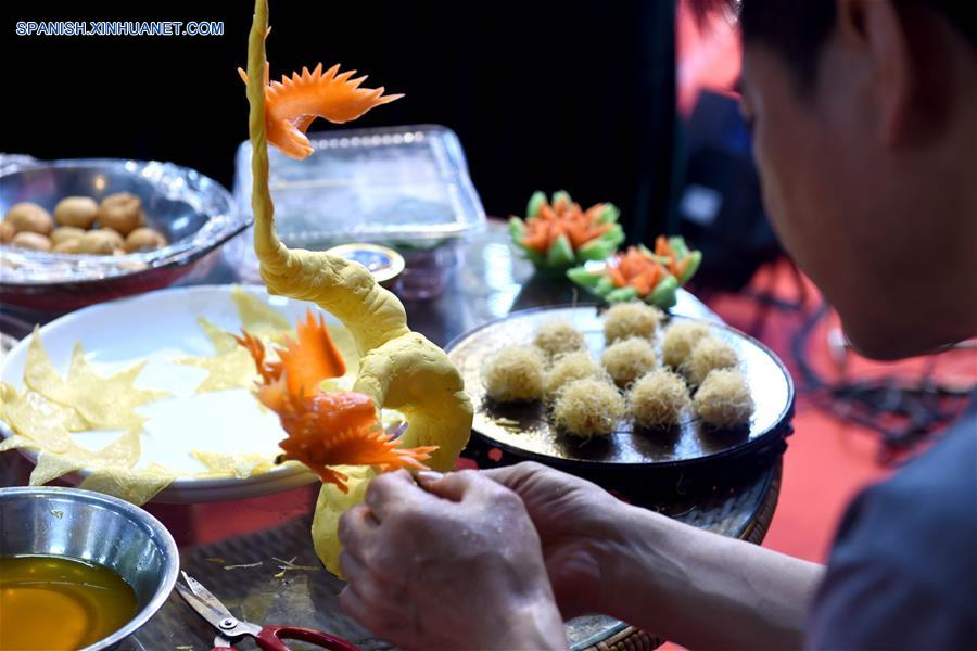 ANHUI, 18 marzo, 2019 (Xinhua) -- Imagen del 21 de septiembre de 2018 de un cocinero preparando un platillo con tofu, durante un concurso en Huainan, en la provincia de Anhui, en el este de China. El sector de la restauración de China registró unos ingresos récord de 4,27 billones de yuanes (636.000 millones de dólares) en 2018, dijo el domingo la Asociación de Cocina de China. Este volumen representó el 11,2 por ciento del total de las ventas minoristas del a?o pasado y fue un 0,4 por ciento superior al de 2017, dijo Jiang Junxian, presidente de la asociación. El sector también aportó un 20,9 por ciento al crecimiento del consumo en 2018, indicó. (Xinhua/Chen Bin)