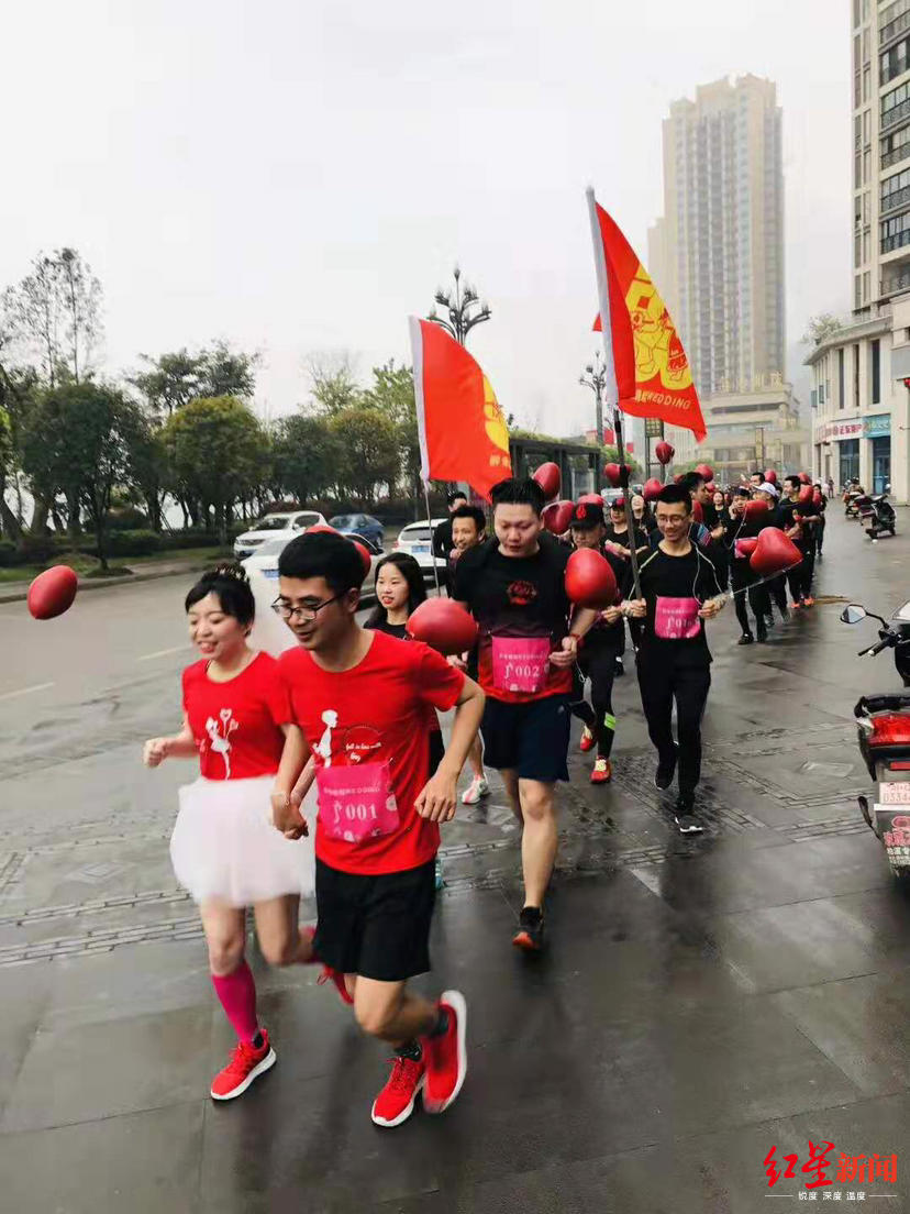 En la ma?ana del 17 de marzo, más de 40 corredores se reunieron en la ciudad de Baixi, distrito de Xuzhou en Yibin, para acompa?ar a la pareja en su día especial.