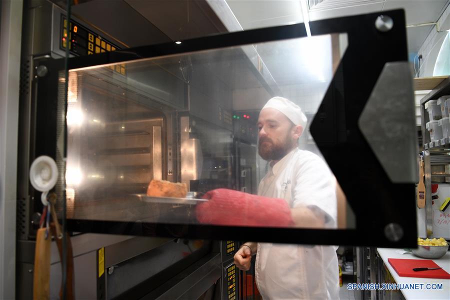 Imagen del 21 de marzo de 2019 del panadero francés Christophe sacando el pan recién horneado en su panadería, en Guangzhou, provincia de Guangdong, en el sur de China. El panadero francés Christophe y su esposa Agnes fundaron su primera panadería francesa llamada "Perma" en 2012 y la segunda un a?o después en Guangzhou. Para satisfacer a los residentes de Guangzhou, Christophe elabora el pan con la integración de los sabores de la panadería francesa y la cultura gastronómica local. A medida que Francia se convierte en un destino turístico cada vez más popular para los jóvenes chinos, la pareja está más dedicada a la elaboración del pan de alta calidad para atender a los clientes chinos. (Xinhua/Liang Xu)