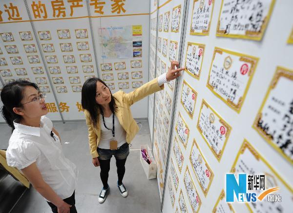 Una mujer está consultando la información de vivienda en una empresa intermediaria antes de comprarla. (Foto: Liu Junxi / Xinhua)