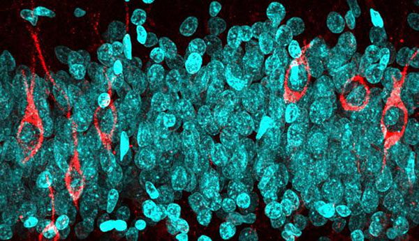 Neuronas inmaduras (rojo) y neuronas maduras (azul) en el giro dentado de un sujeto cognitivamente sano de 68 a?os de edad. - María Llorens-Martín